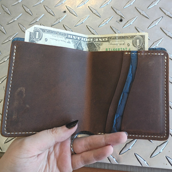 This gorgeous leather Billfold Wallet is made with Wickett and Law's Blue Palisades Bison and Seidel's Predator Whiskey. It features 3 card slots and an interior cash pocket,