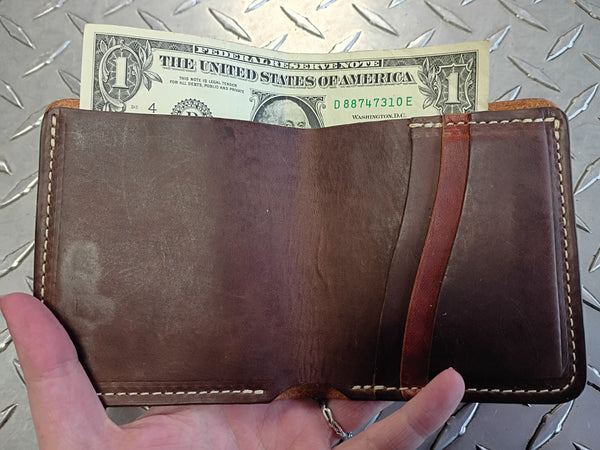 This gorgeous leather Bifold Wallet is made with Horween's Predator Whiskey and Wickett and Craig's Tan Latigo. It features three card slots and an interior cash pocket,